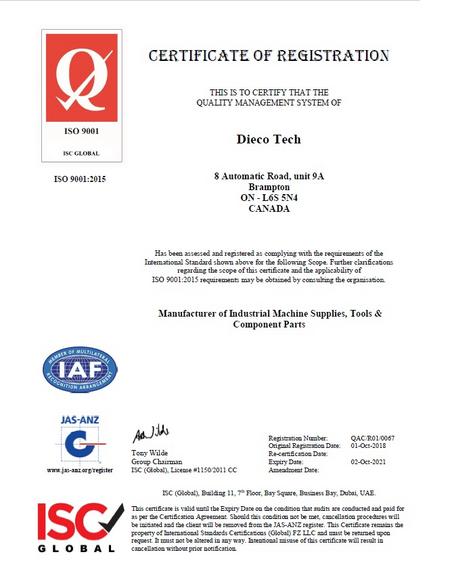 Here at Dieco-Tech, quality matters! We want to ensure that we always deliver our customers with effective products and services that meet or exceed expected standards of quality. As a result, we're ISO 9001:2015 certified. We've implemented internationally recognized standards for quality control, in our management systems and processes, to ensure we meet customer and regulatory requirements wherever possible.