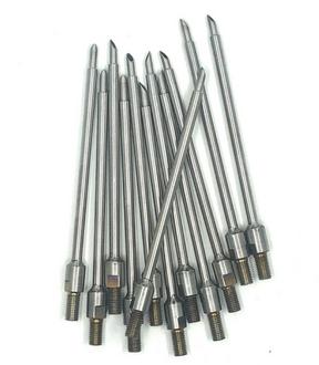 304-series stainless steel blow needles are designed for blow molding manufacturing processes to form plastic parts for end-users. These needles are designed with an angled-tip, at the mouth of the needle to help pierce plastic, and thru-holes near tube tip for compressed air flow. These can be used in conjunction with our stainless steel and/or brass blow needle cylinders.